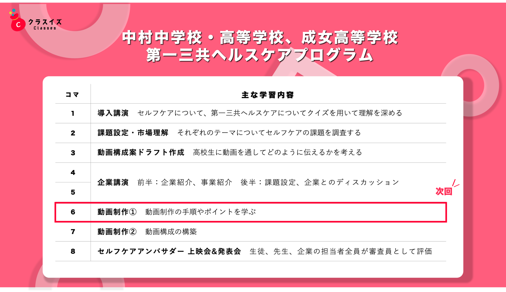 生徒たちは、第一三共ヘルスケアの「セルフケアアンバサダー」として、日々の生活に欠かせないセルフケアやヘルスリテラシーを自らの武器として身につけ、社会に向けて発信することに挑戦します。