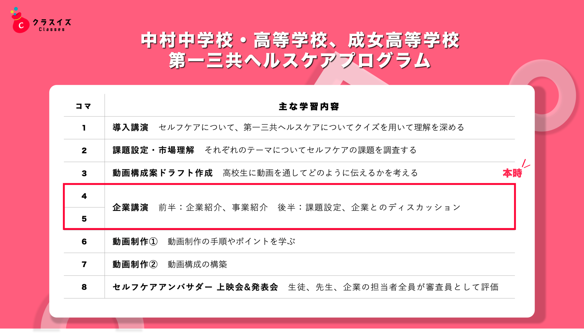本プログラムは、東京都内の私立女子校である中村中学校・高等学校と成女高等学校の中学3年生〜高校2年生の希望者を対象に、両校が連携して実施する第一三共ヘルスケアとの連携プログラムです。