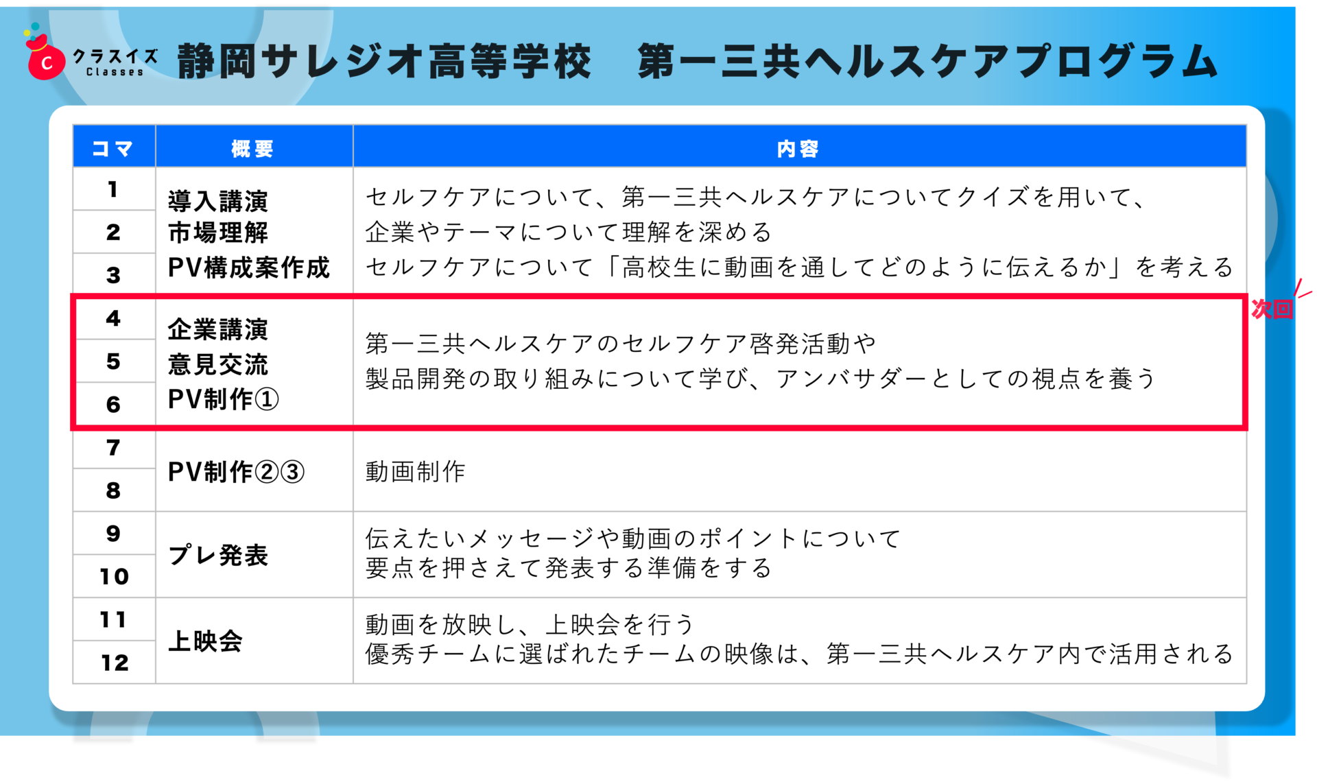 生徒たちは初回から非常に積極的で、クイズやディスカッションを通じて自分の考えを言葉にする姿が印象的でした!テーマごとにリーダーシップを発揮する生徒も多く、互いの意見を尊重しながらチームとして形を作り始めていました。第一三共ヘルスケアの理念に共感し、「自分たちも誰かに伝える側になりたい」という意識が自然に生まれていたことが嬉しかったです!!