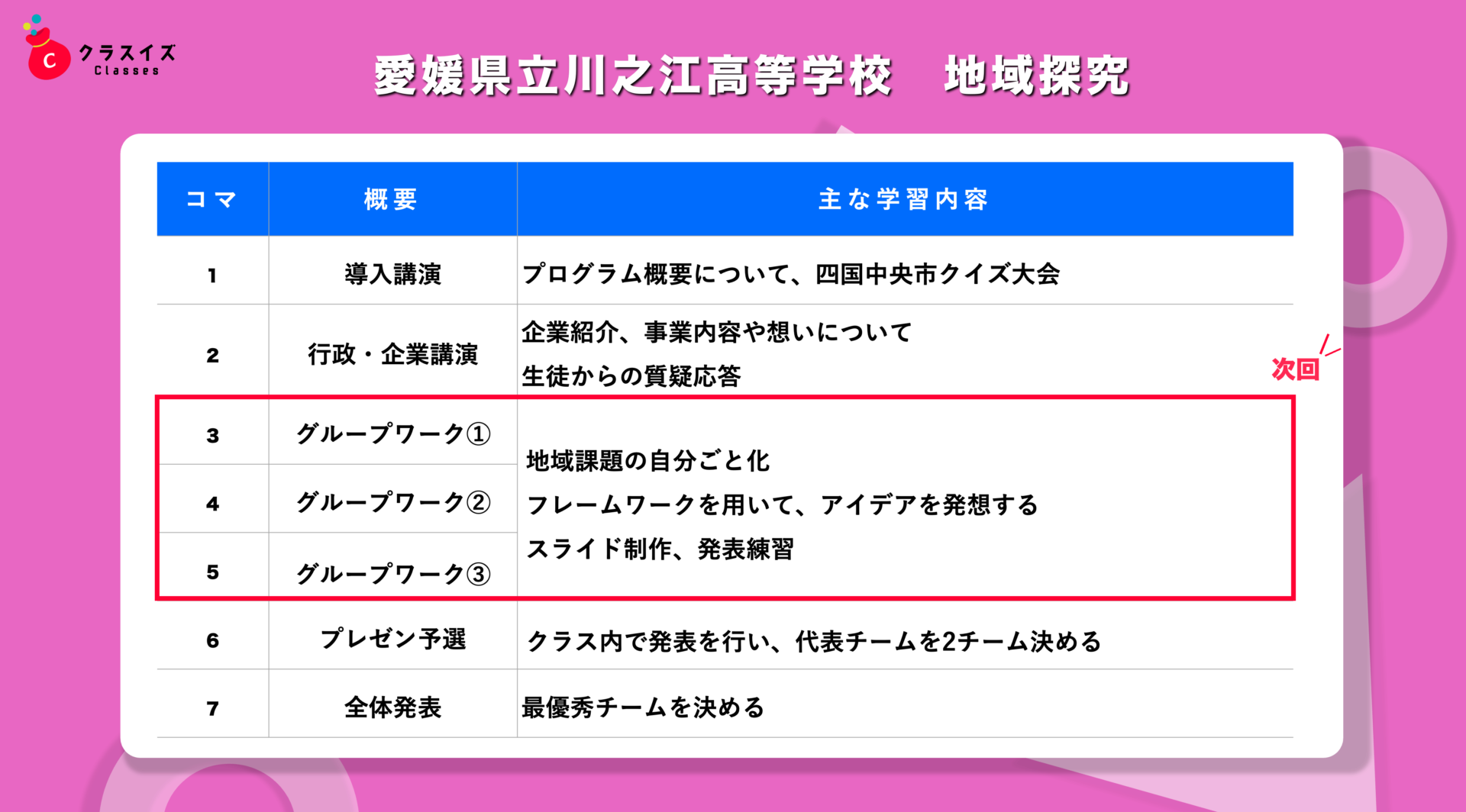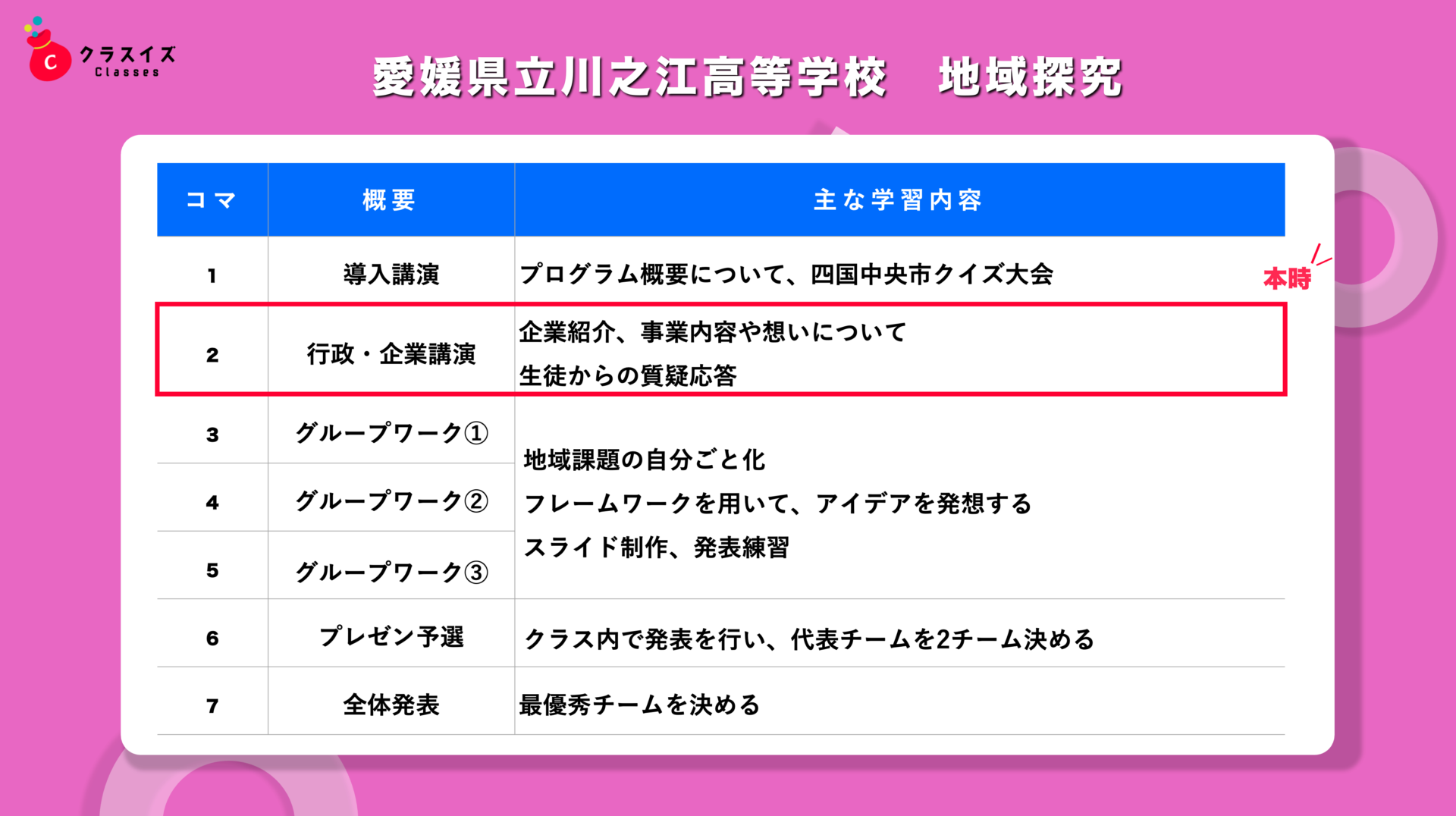 本プログラムは、愛媛県立川之江高等学校3年生108名を対象に実施する、四国中央市・大王製紙株式会社・ユニ・チャーム株式会社と連携した地域探究プログラムです。