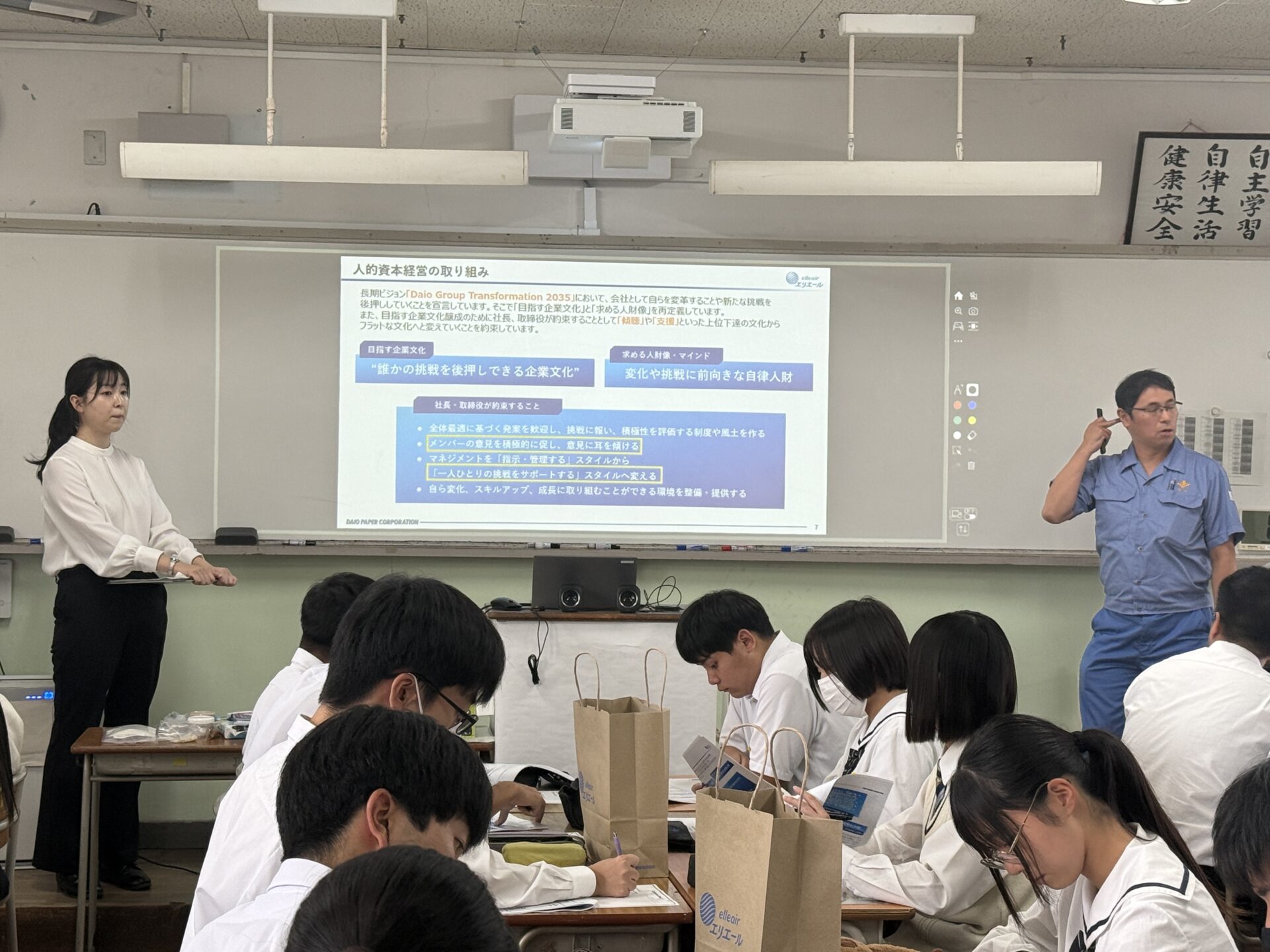 四国中央市役所からは、「紙のまち」としての歴史や現在のまちづくりの取り組み、大王製紙・ユニ・チャームからは、製紙産業や化学分野でのサステナビリティ、環境配慮型商品の開発などが紹介されました。生徒たちは、「ペーパーレス時代」と言われるなかで、企業がどのように新しい価値を生み出しているのかに関心を寄せ、メモを取りながら真剣に耳を傾けていました。質疑応答では、「海外では紙の需要はどうなっているか?」「サステナブル素材はどのように開発しているか?」といった質問も挙がり、地元産業を“働く視点”から考える姿勢が見られました。