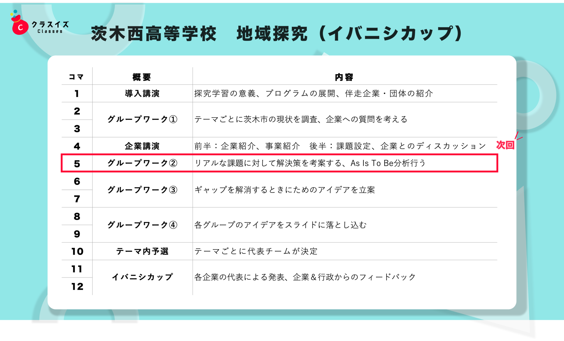 本プログラムは、大阪府立茨木西高等学校の1年生240名を対象に実施する、地域連携型の探究プログラム。