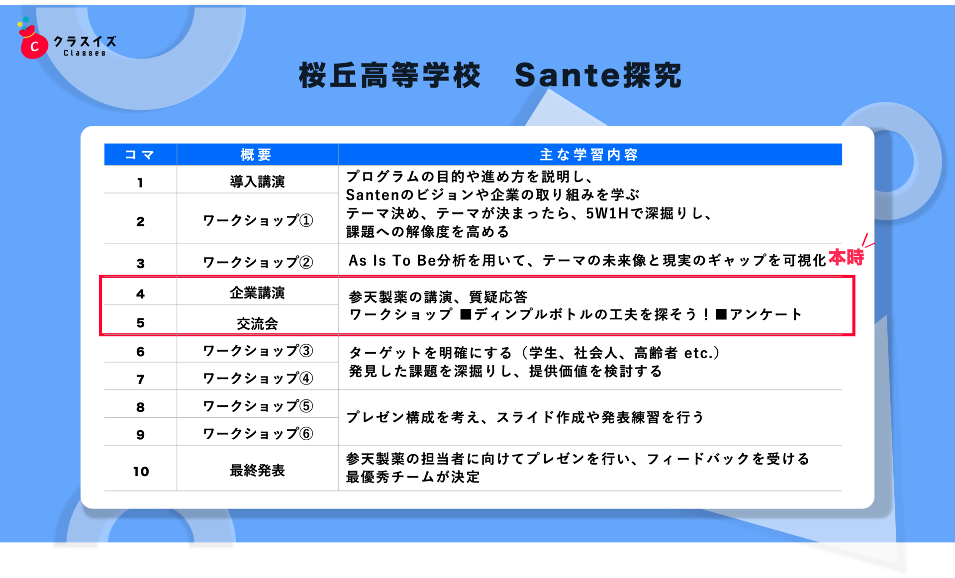 本プログラムは、桜丘高等学校1年生探究コース31名を対象に実施する、参天製薬との連携による探究型プログラム。