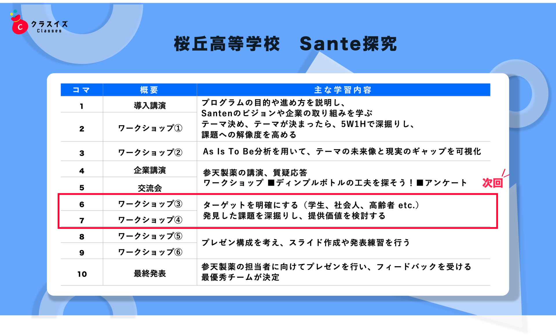 • ・ 参天製薬の一員として新規事業の企画を体験し、課題発見から解決策の提案までの探究サイクルを学ぶ