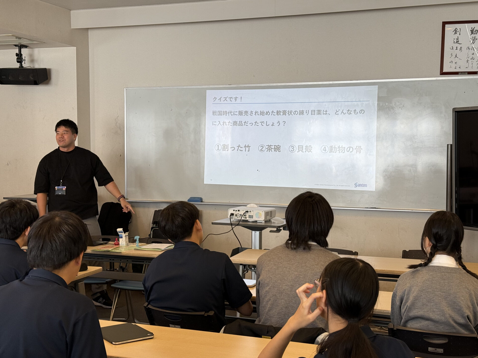 生徒たちは、普段なかなか聞く機会のない製薬企業の社会的役割や、新薬開発の裏側にある想いを真剣な表情で聞き入っていた。